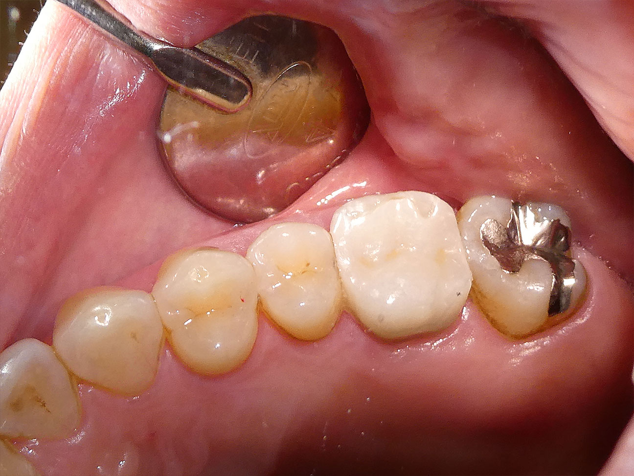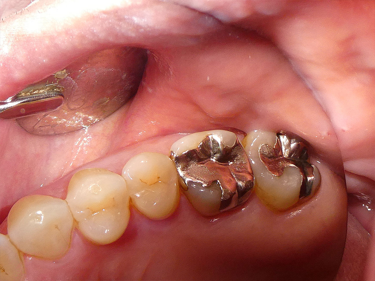 奥歯を保険の金属の詰めもの(パラジウムアンレー)で治療されていましたが、保険の金属による詰めものは長く使うあいだにすき間が生まれ、そのすき間から虫歯菌が入ることで、どんなに丁寧な歯磨きを頑張っても金属の詰めものの下では虫歯が進行していきます。写真を目視されても段差や隙間はお分かりになると思います。