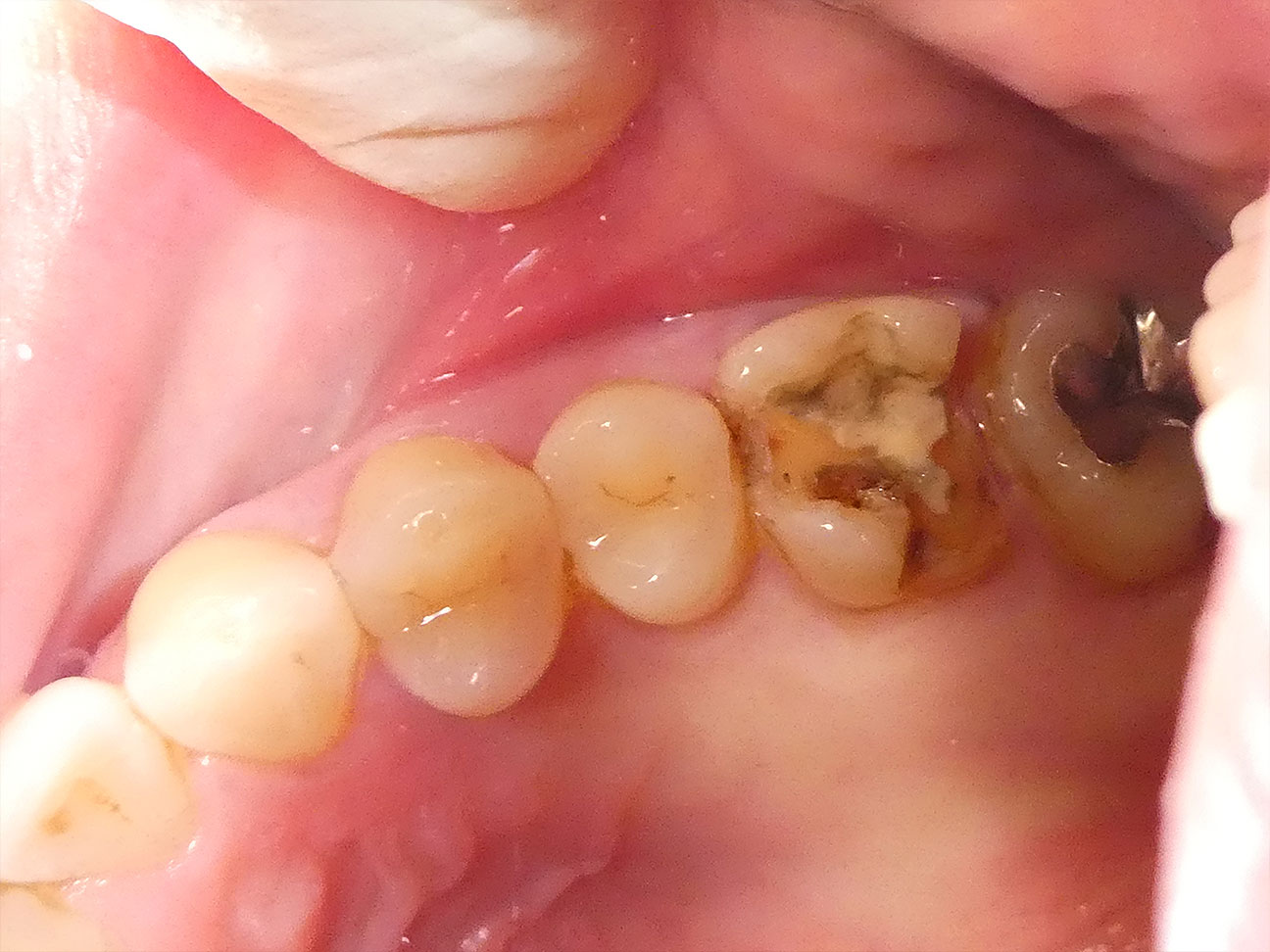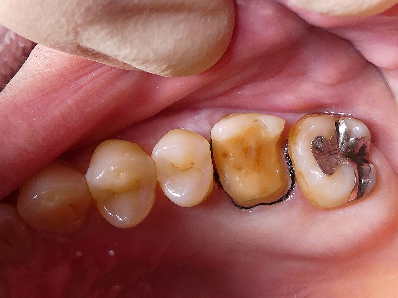 患者さんは50代の女性です。保険による金属の詰めものすき間から虫歯菌が入り込み、金属の詰めものに隠れて虫歯が進行していました。食べ物がはさまる、痛いというお悩みから、白く自然な見た目の少し大きめの詰めもの「ジルコニアアンレー」を自由診療で治療しました。