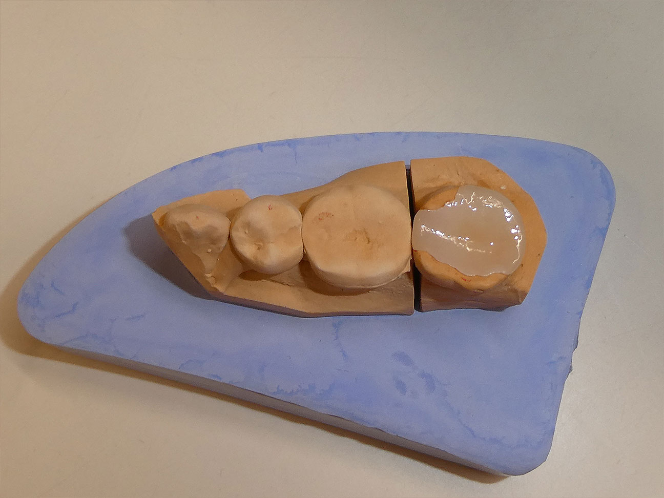 印象から約10日で完成したジルコニアインレーをお口に接着し治療を終えました。このように自然な白さで審美性も高く、ご自分の歯との隙間もなくピッタリと接着されていることがお分かり頂けると思います。複雑な奥歯の形にピッタリと収まるように、歯科技工士と連携をして、このように精密な詰めものを作成します。