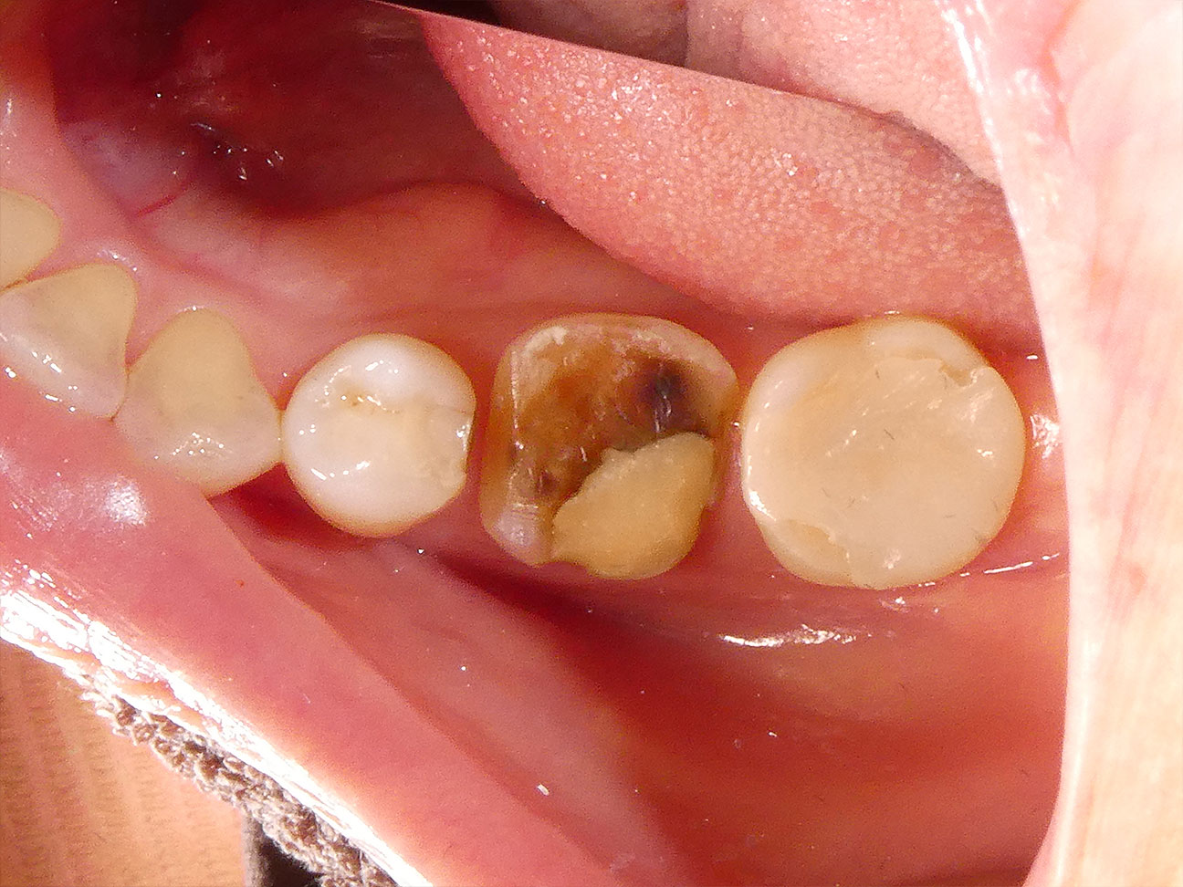 奥歯の治療から約3ヶ月後に、保険で治療した金属の被せ物が取れてしまったということでご来院になりました。ご覧のとおり以前あった保険の銀歯がなくなっています。最初のプラスチックの詰めものをジルコニアインレーで修復する際にもお伝えしましたが、噛みしめ・食いしばり傾向の強い患者さんのため、特に力の大きく加わる奥歯はの治療はどうしても保険治療の範囲では限界があります。
