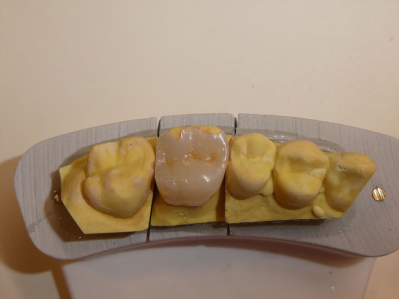 完成したジルコニアアンレーです。複雑な奥歯の形にピッタリと収まるように、歯科技工士と連携をして、このように精密な詰めものを作成します。