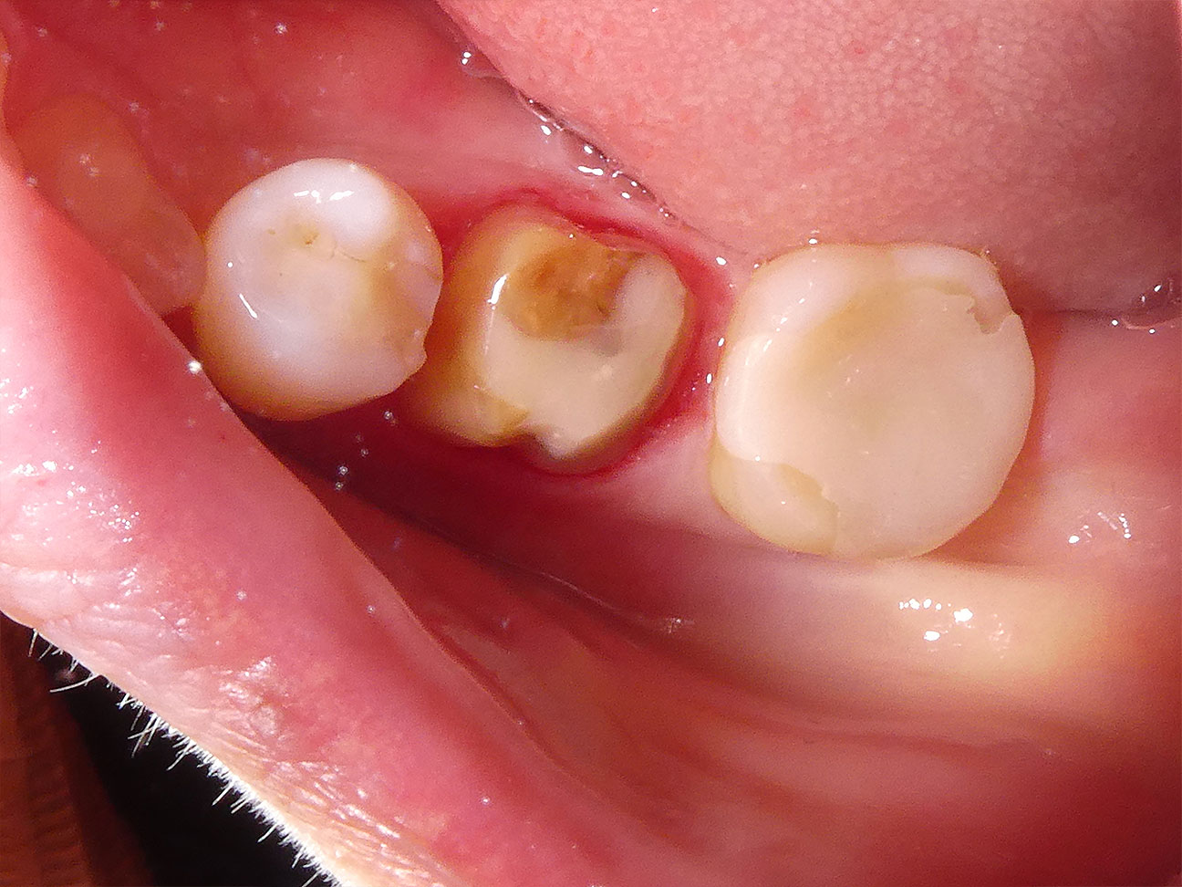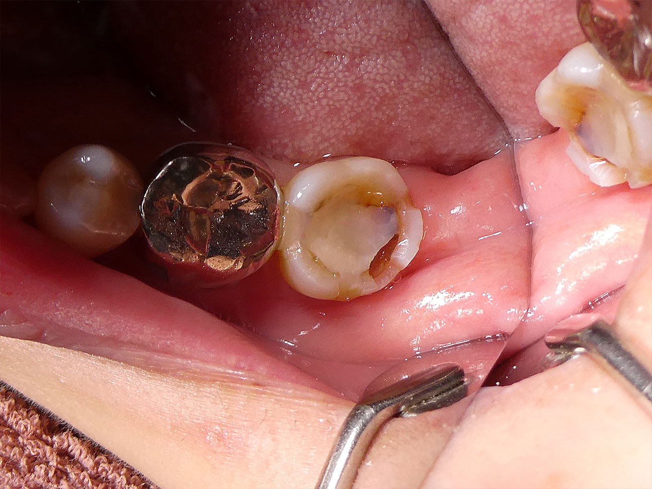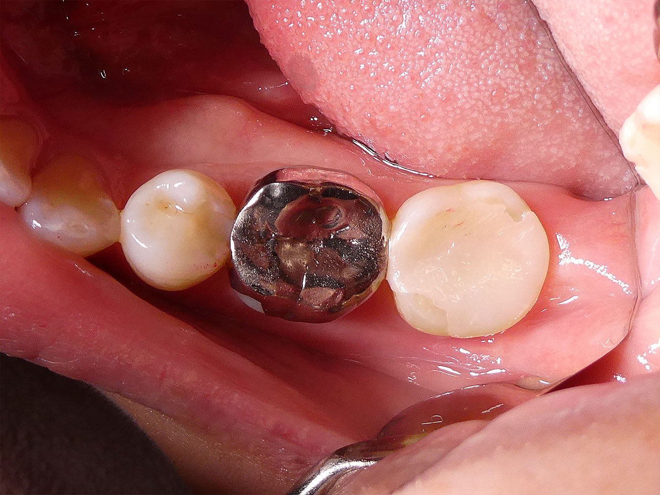 奥歯の治療から約3ヶ月後に、保険で治療した金属の被せ物が取れてしまったということでご来院になりました。ご覧のとおり以前あった保険の銀歯がなくなっています。最初のプラスチックの詰めものをジルコニアインレーで修復する際にもお伝えしましたが、噛みしめ・食いしばり傾向の強い患者さんのため、特に力の大きく加わる奥歯はの治療はどうしても保険治療の範囲では限界があります。